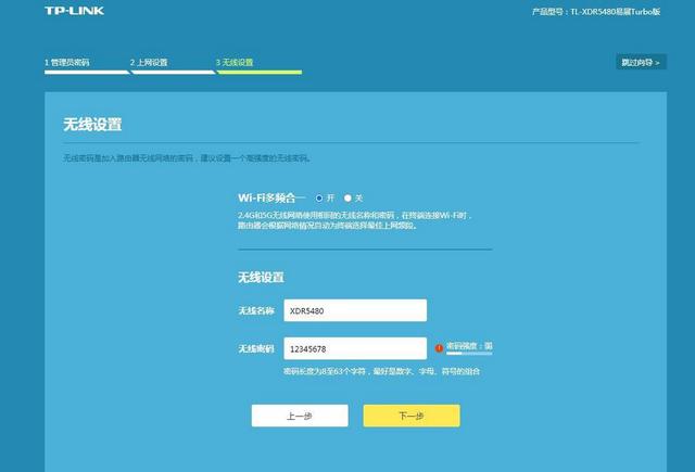 最后一步进行无线wifi设置,输入无线名称和无线密码后点击确定。