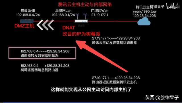 这个也是利用NAT技术做目的IP地址转换或目的端口转换。不过此行为的目的是为了从公网主动访问内网。一般情况下,一台计算机从公网想要主动连接局域网内的一台计算机是不可能的,因为数据包的目的IP地址是公网地址,发送到路由器WAN口后,路由器以为这个数据包是传给自己的,然而实际却不是给自己的。在路由器上配置端口映射后,当公网主动传来数据包时,路由器判断是否要将数据转发给内部主机。假设在路由器上配置dmz主机,内网主机地址为192.168.0.4,那么路由器收到公网发送的数据包后,会把数据包的目的IP地址改为192.168.0.4,重新封装后转发给内部的树莓派。此行为相当于将树莓派主机直接映射在公网环境中,这样就能实现从公网主动访问内部主机了。