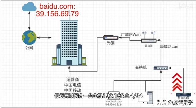 网络数据包长距离传输的过程中,会经过一个个的路由器,我们拿局域网内一台主机和百度的通讯举个例子,假设局域网内一台主机192.168.0.4/24要访问公网上的百度主机39.156.69.79。主机查询自己的路由表,把数据包发送给谁呢?