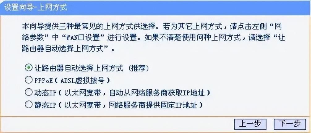 三.点击“下一步”,弹出选择上网方式界面,可根据您所使用的宽带上网方式进行选择,如不清楚,可以选择“让路由器自动选择上网方式”,点击“下一步”。如下图示。