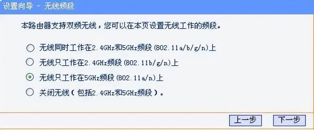 五.点击“下一步”弹出无线频段设置界面。使用5GHz频段,可以选择同时开启2.4GHz和5GHz或者只开启5GHz,此例以只开启5GHz为例,选择“无线只工作在5GHz频段”,如下图示。