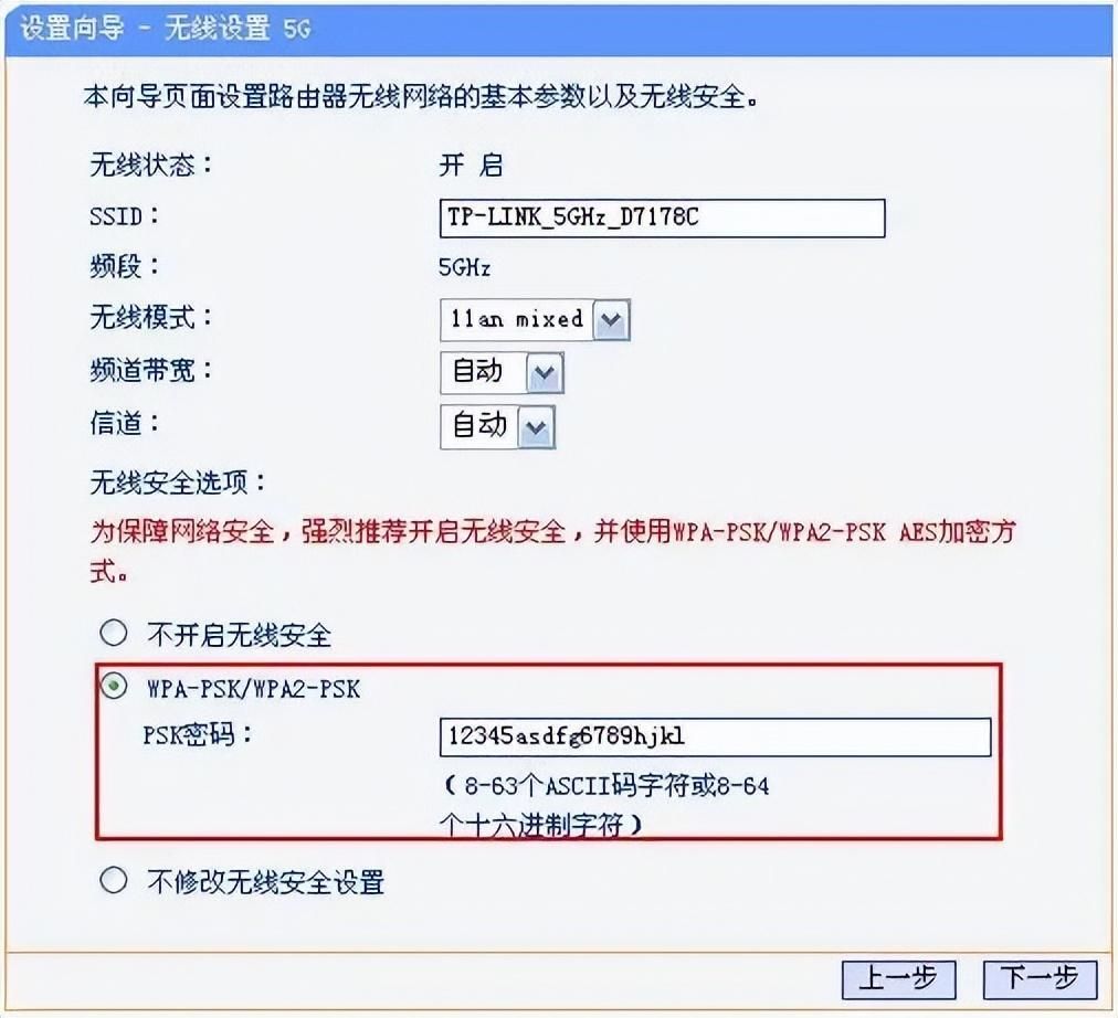 六.点击“下一步”,弹出无线设置5GHz频段无线参数的界面,设置SSID无线信道无线安全等选项,无线安全选项推荐“WPA-PSK/WPA2-PSK”,如下图示。