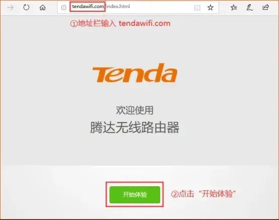 二、设置路由器,打开浏览器,在地址栏中输入“tendawifi.com”或者“192.168.0.1”,点击回车键或者Entet键,进入路由器设置页面,点击开始体验