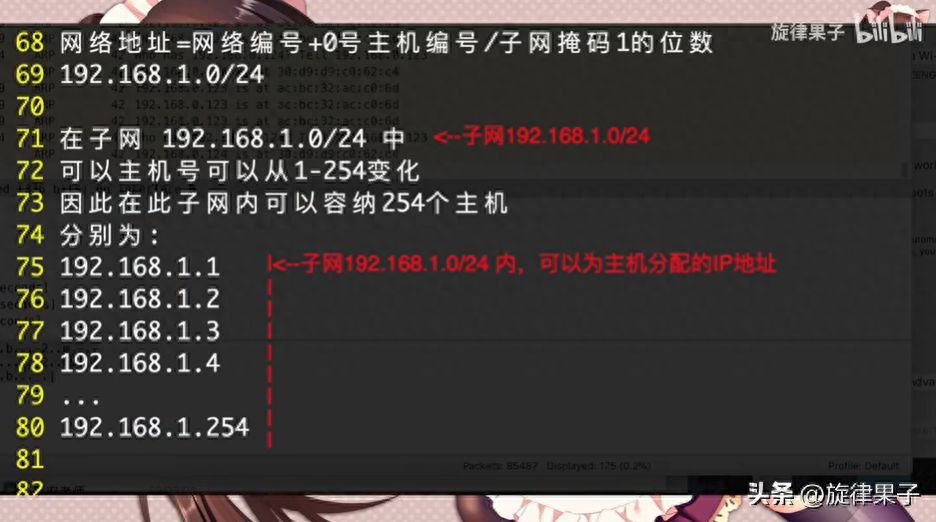 现在我们看看子网的表示方法,我们使用IP地址的网络地址+0号主机地址再加一个斜杠,后面跟子网掩码的1的位数。比如IP为192.168.1.1,掩码为255.255.255.0,那么这个IP所在的子网可以写为192.168.1.0/24,子网内的主机号可以为1-254,也就是192.168.1.1-192.168.1.254。