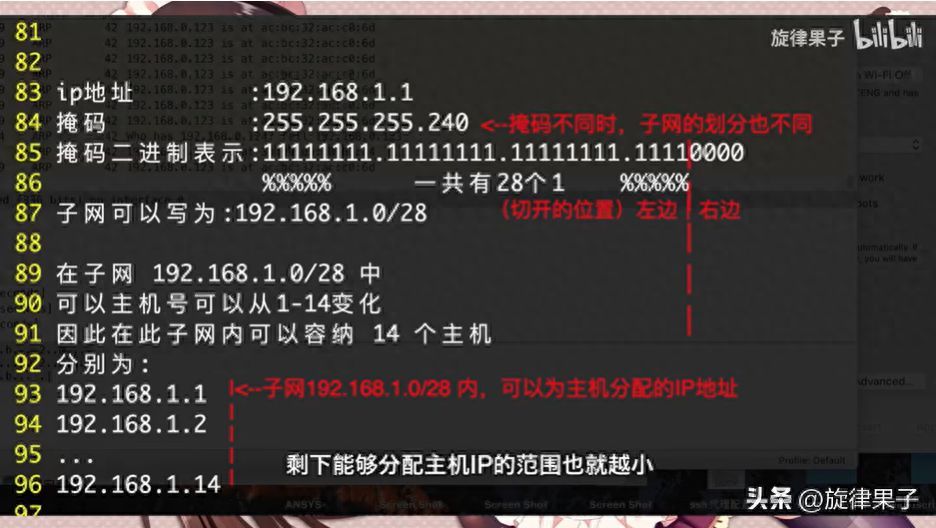 如果掩码为255.255.255.240(11110000),那么子网可以写为192.168.1.0/28,主机号可以为1-14。我们可以看到,当子网掩码的1越多,剩下能够分配主机IP的范围也就越小,有时候也会很不方便。比如192.168.1.1/28和192.168.1.17/28就需要跨子网通信了,很不方便,所以配置子网时要结合需求来配置。
