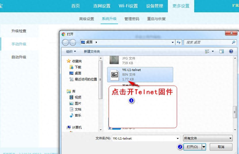 3、点击上传文件,浏览电脑中文件找到路由宝开Telnet固件,点击文件,然后点击下面的打开。上传成功后,通过验证,确认升级。等几分钟后路由宝重启。