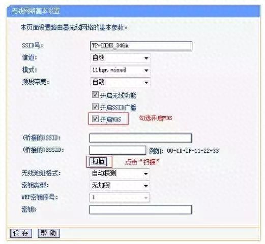 (2)打开路由器B的无线基本设置,勾选WDS,然后扫描到第一台路由器。