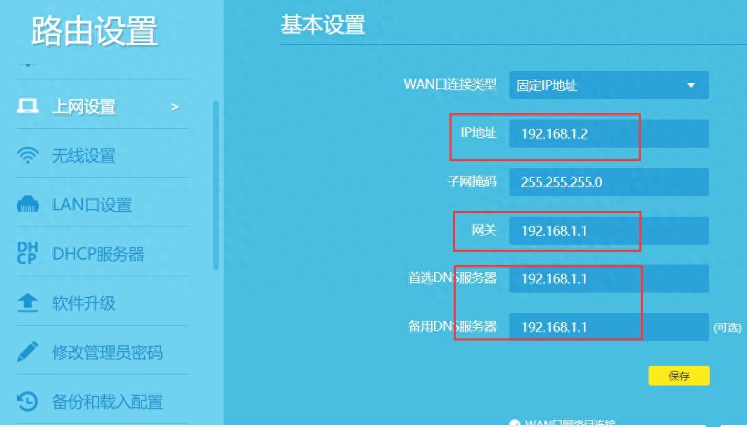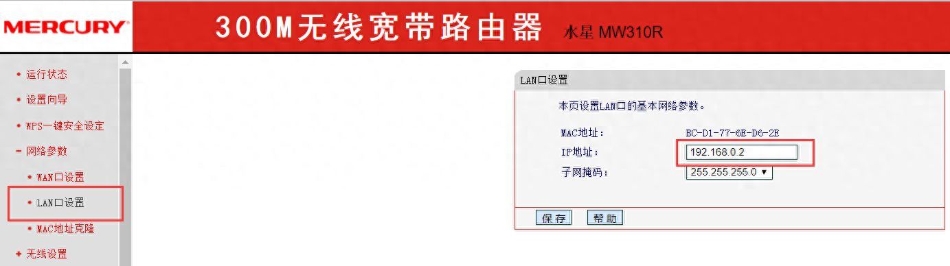 首先,进入副路由器的界面,改LAN口设置为192.168.0.2,为什么改成这个,因为192.168.0.1是主路由器的登录地址,也是主路由器的网关,因此需要设置成不同的IP,到时候桥接配置完才能正常登录访问指定路由器。