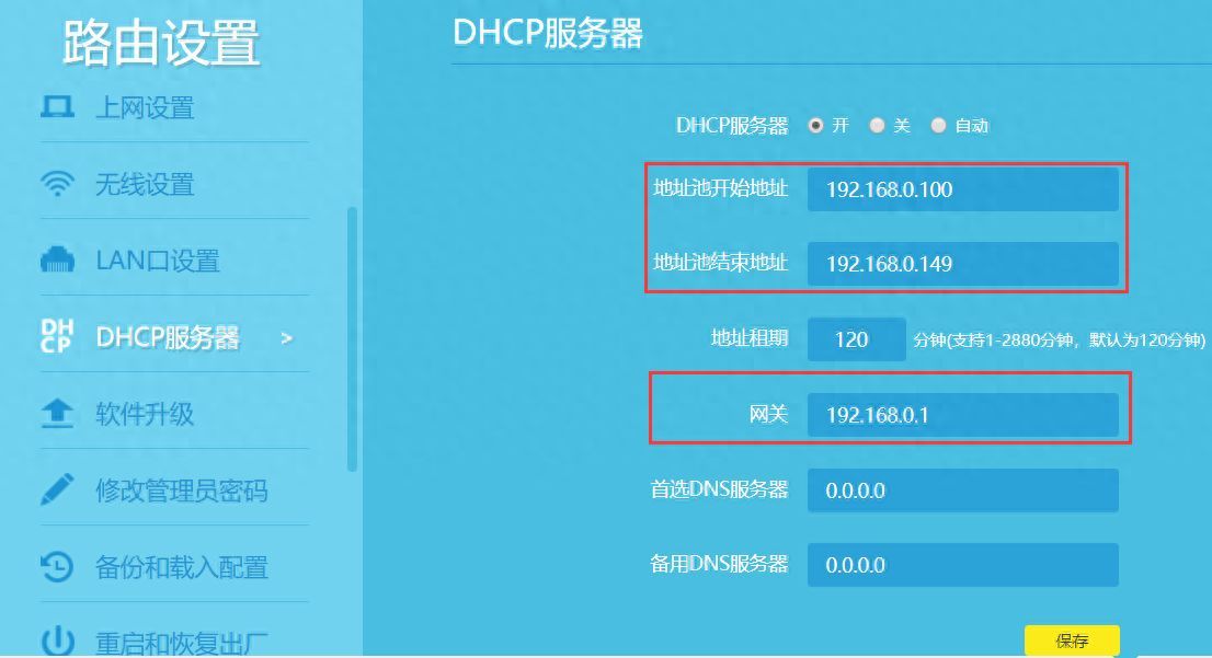 之后来到DHCP服务器,发现,地址池的网段和LAN口的网段是一致的,但需要把地址池IP段的范围改一下,因为副路由器也准备开启DHCP服务器,所以需要预留一部分IP地址出来。按照如图所示的改好之后,再来看网关,这个网关的意思是指主路由器的网关,是下级路由器连接主路由器的关口,因此是192.168.0.1,也即主路由器的登录地址。