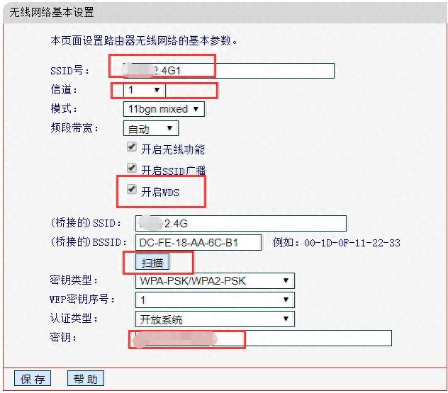 其次再进入“无线设置”,开启“WDS”,扫描无线信号,选定主路由发出的无线信号,然后填入相应的密码。副路由器的无线信号名称随便设置(和主路由器无线信号名称一样也行),信道和主路由的信道一致,模式一致,最后保存就行!