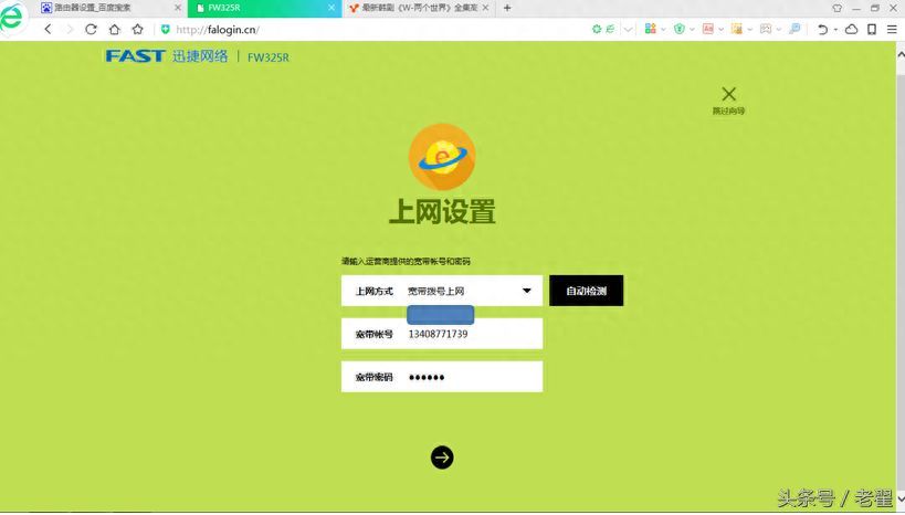 当检测联网方式为宽带拨号时,需要输入“宽带帐号”和“宽带密码”。