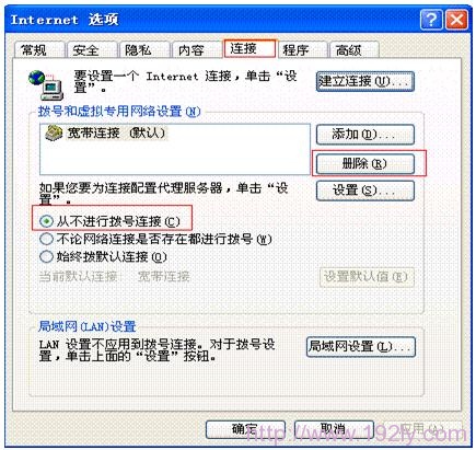 点击浏览器里面的“工具”---“Internet选项”----“连接”,如果是拨号上网的用户,请先删除“宽带的拨号连接”,并选择“从不进行拨号连接” 。