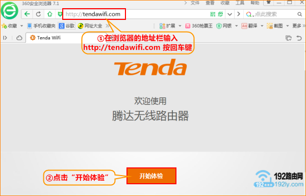 打开笔记本电脑中的浏览器,在浏览器中输入路由器的设置网址,我这里输入:tendawifi.com——>然后点击“开始体验”,如下图所示。