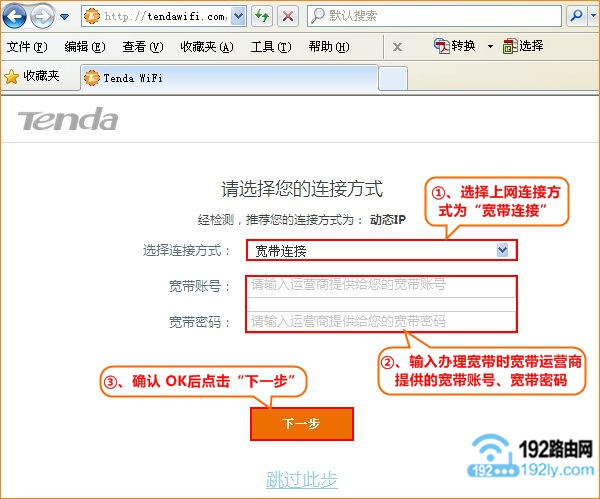 如果你的宽带情况与上面介绍的一致,则这里的“连接方式”就应该选择:宽带连接——>然后填写宽带运营商提供的“宽带账号”、“宽带密码”——>点击“下一步”。