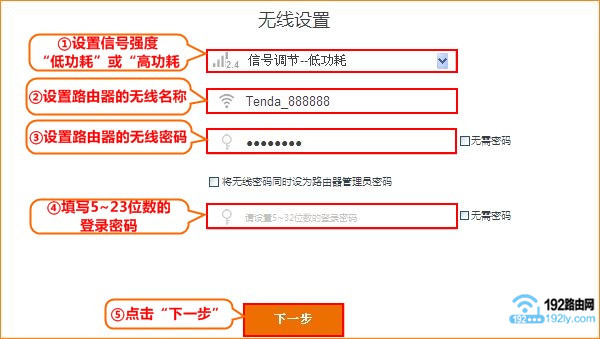 设置“信号强度”为:低功耗 或者 高功耗——>“无线名称”、“无线密码”以及“登录密码”——>点击“下一步”。