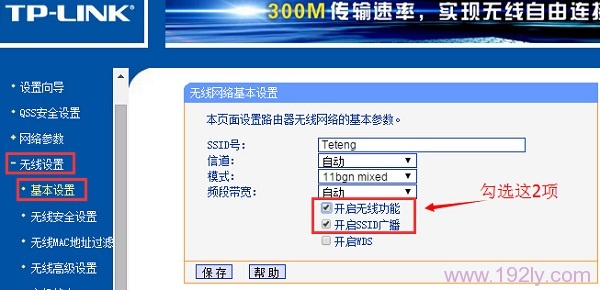 进入无线路由器的设置界面,在“无线设置”——>“基本设置”选项下面,查看“开启无线功能”和“开启SSID广播”这2个选项是否勾选。如果没有勾选,请勾选上这2个选项。