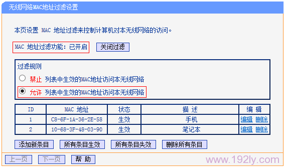 “无线MAC地址过滤”功能,可以用来限制哪些无线设备可以连接wifi上网的,与手机来电的“白名单”、“黑名单”功能类似。设置方法如下: