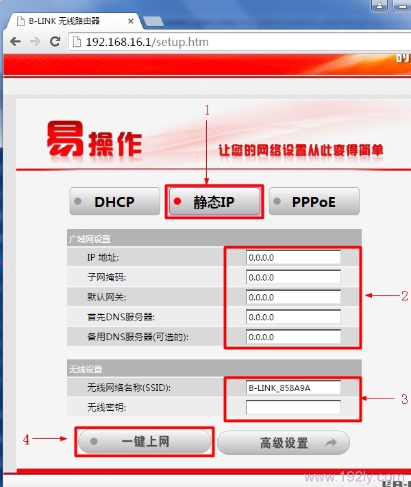 点击“静态IP”——>填写宽带运营商提供的IP地址、子网掩码、默认网关、DNS服务器信息——>用户自定义设置“无线网络名称(SSID)”和“无线密钥”——>点击“一键上网”