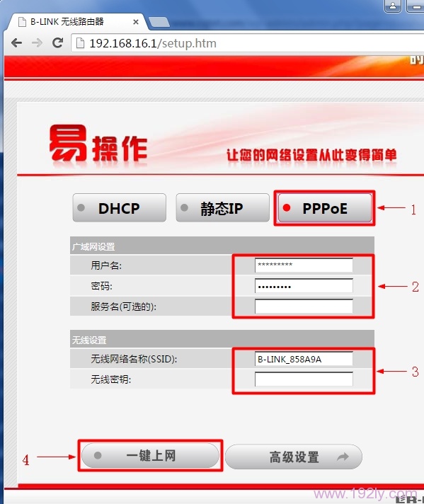选择:PPPoE——>“用户名”填写:宽带账号——>“密码”填写:宽带密码——>用户自定义设置“无线网络名称(SSID)”和“无线密钥”——>点击“一键上网”,如下图所示。