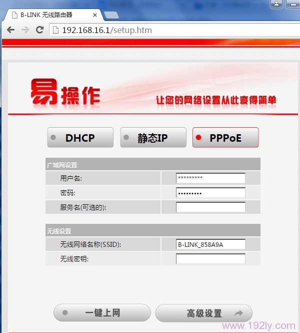(1)、PPPoE:办理宽带业务后,宽带运营商会提供“宽带账号”、“宽带密码”给用户;且在未使用路由器时,电脑上需要使用“宽带连接”(类似的程序)拨号上网。如果你办理的宽带是这种情况,那么在设置192.168.16.1路由器时,上网方式就应该选择:PPPoE,详细设置如下所示