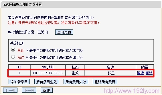 5、可以在无线网络MAC地址过滤设置界面查看到刚才添加的条目