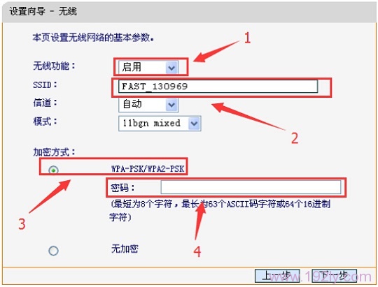 6、设置FW313R的无线网络:“无线功能”选择:启用——>设置“SSID”,SSID即无线网络名称,用户根据自己的需求进行设置——>勾选“ WPA-PSK/WPA2-PSK”——>设置“PSK密码”——>点击“下一步”。