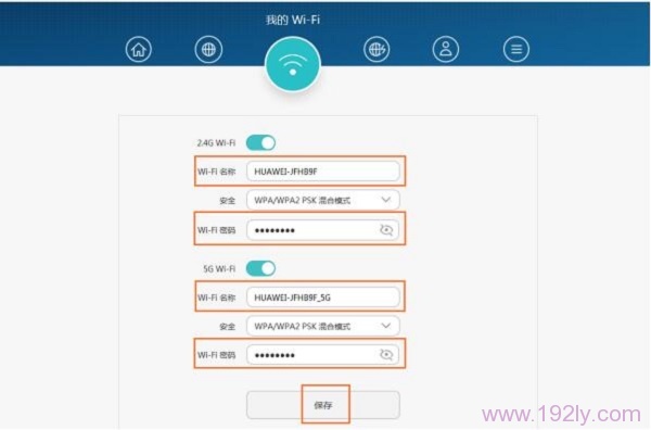 点击“我的Wi-Fi”选项后,可以分别设置2.4GWiFi名称、WiFi密码,5GWiFi名称、WiFi密码——>然后点击“保存”,如下图所示