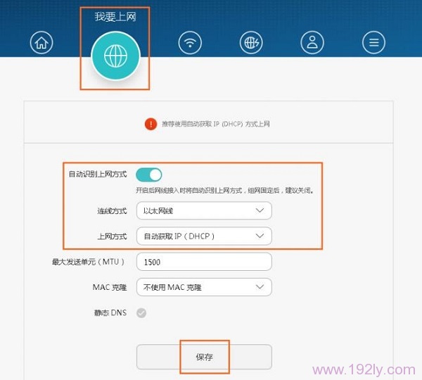 (2)、如果打开“自动识别上网方式”后,检测到“上网方式”是:自动获取IP(DHCP)——>直接点击“保存”即可