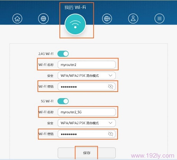 点击“我的Wi-Fi”选项后,可以分别设置2.4GWiFi名称、WiFi密码,5GWiFi名称、WiFi密码,如下图所示