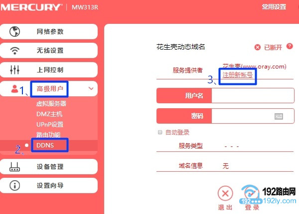 其实,新版水星路由器中的动态DNS的配置,是非常简单的。只要到花生壳网站,注册一个账号就可以,然后在路由器中登录这个账号。