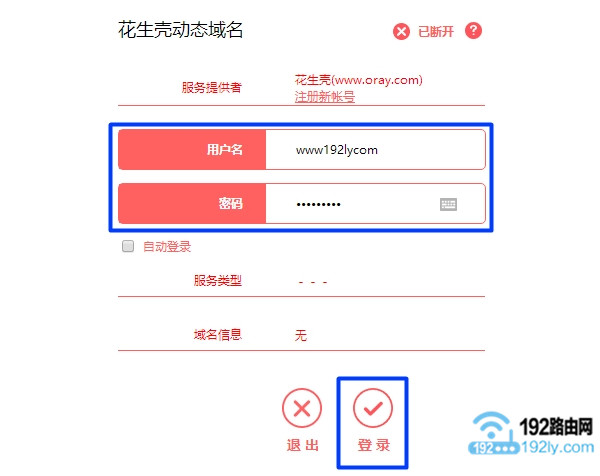 回到水星路由器的“DDNS”设置页面——>在“用户名”、“密码”选项中,输入刚才注册的花生壳的账号、密码 进行登录