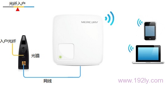 2、光钎上网:准备1根较短的网线,一头连接光猫,另一头连接另一头连接水星MW300RM路由器上的WAN/LAN接口,如下图所示。