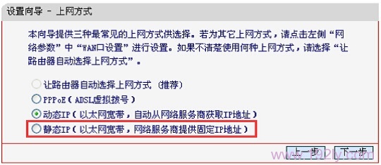 静态IP上网设置:选择“静态IP(以太网宽带,网络服务商提供固定IP地址)”——>点击“下一步”。