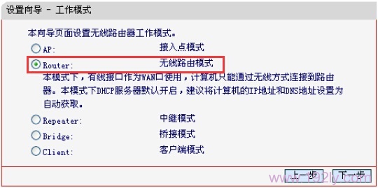 2、选择工作模式:这里需选择“Router:无线路由模式”——>点击“下一步”。