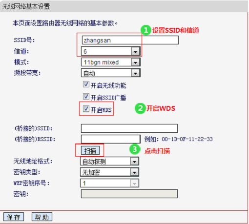 点击“无线设置”——>“无线基本设置”——>把“SSID”和“信道”设置为与主路由器的参数相同——>勾选“开启WDS”——>点击“扫描”