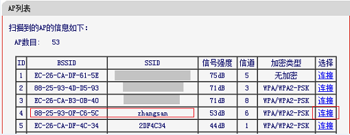 在扫描结果中,找到主路由器的SSID(本例中是:zhangsan),然后点击后面的“连接”。