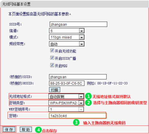 选择与主路由器相同的“密钥类型”——>在“密钥”位置输入主路由器的无线密码——>点击“保存”。