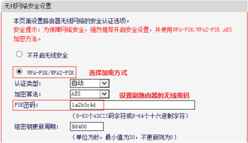 点击“无线设置”——>“无线安全设置”——>选择“WPA-PSK/WPA2-PSK”——>“PSK密码”处填写和主路由器相同的无线密码——>点击页面下方的“保存”。