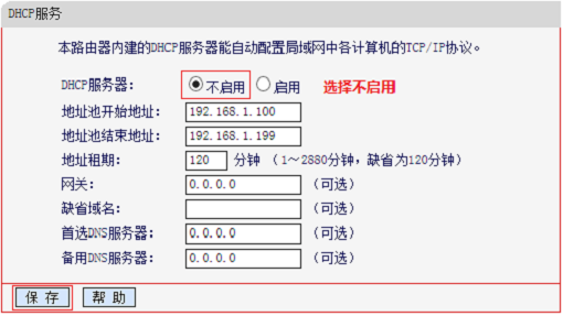 在副路由器(MW305R)的设置页面,点击“DHCP服务器”——>“DHCP服务设置”——>“DHCP服务器”选择:不启用——>点击“保存”。