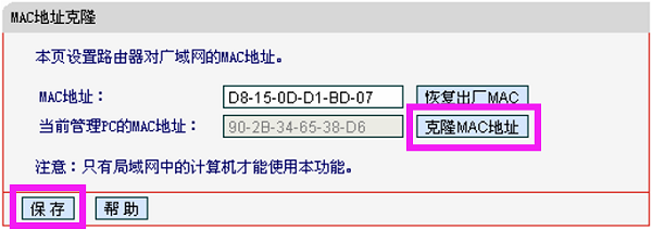 点击“网络参数”——>“MAC地址克隆”——>点击“克隆MAC地址”——>“保存”,如下图所示。