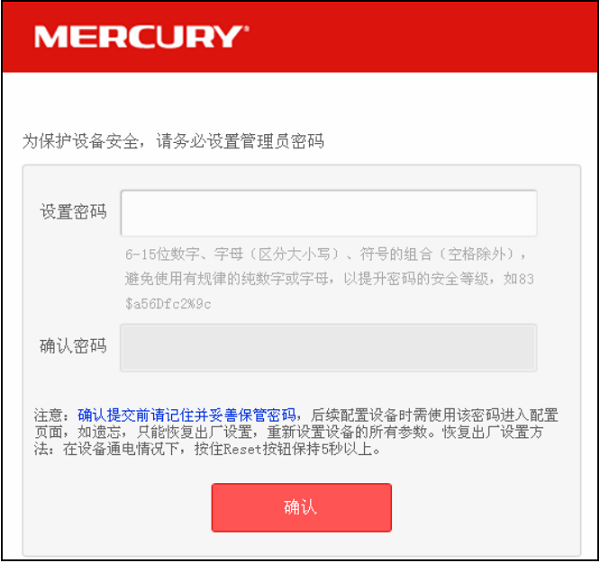 新购买(恢复出厂设置)的水星MW456R路由器,第一次对其进行设置时,当在浏览器中输入melogin.cn时,会自动弹出创建管理密码的界面。此时,用户只需要根据页面的提示,自己创建一个密码就可以了。