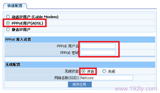 PPPoE用户(ADSL)设置:选择“PPPoE用户(ADSL)”——>在“PPPoE用户名”后输入宽带账号——>在“PPPoE密码”后输入:宽带密码——>“无线状态”选择:开启——>点击“保存应用”。