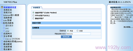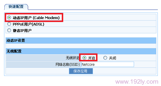 动态IP上网设置:选择“动态IP用户(Cable Modem)”——>“无线状态”选择:开启——>点击“保存应用”