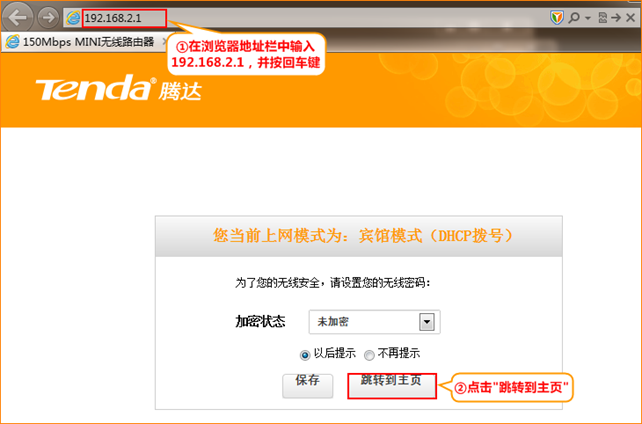 1、登录设置界面:运行电脑上的浏览器,在浏览器中输入192.168.2.1 按回车键(Enter键)——>在跳转的页面中点击“跳转到主页”。(如果192.168.2.1打不开,请阅读文章:腾达(Tenda)无线路由器192.168.2.1打不开的解决办法)