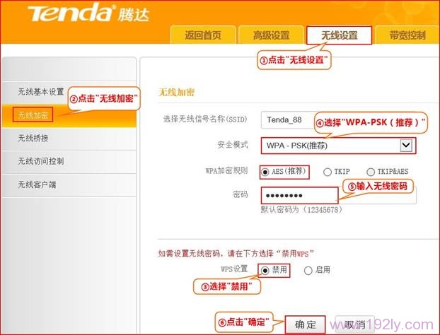 1、点击“无线设置”——>“无线加密”——>“WPS设置”选择:禁用——>“安全模式”选择:WPA-PSK(推荐)——>“WPA加密规则”选择:AES(推荐)——>设置“密码”——>点击“确定”——>在弹出的界面中再次点击“确定”。