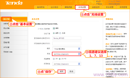 2、无线信道设置:点击“无线设置”——>“基本设置”——>“信道”建议选择:1、7、