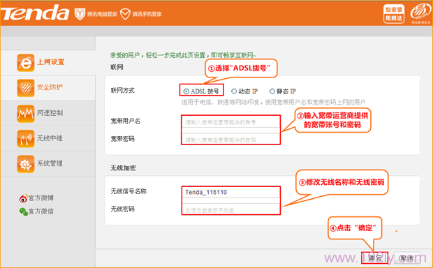 “上网方式”选择:ADSL拨号——>填写“宽带用户名”、“宽带密码”——>设置“无线信号名称”和“无线密码”——>点击“确定”。