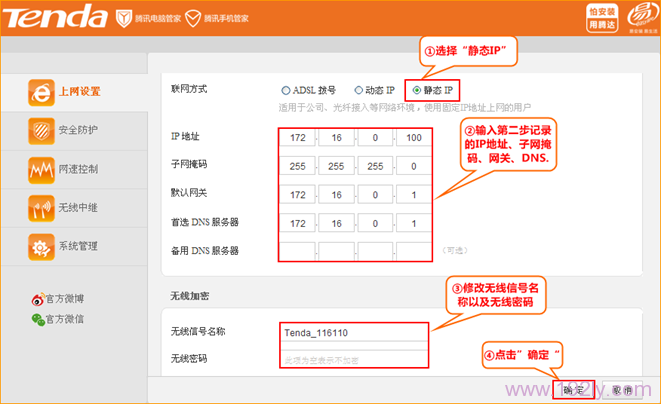 “上网方式”选择:静态IP——>填写“IP地址”、“子网掩码”、“默认网关”、“首选DNS”、“备用DNS”——>设置“无线信号名称”和“无线密码”——>点击“确定”。