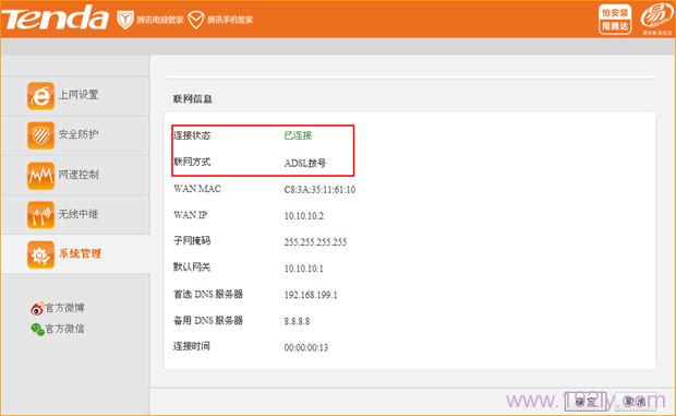 点击“系统管理”——>查看“连接状态”,如果显示:已连接,说明设置成功。(适合ADSL拨号、动态IP;静态IP上网方式,请直接用电脑测试,看能否上网)