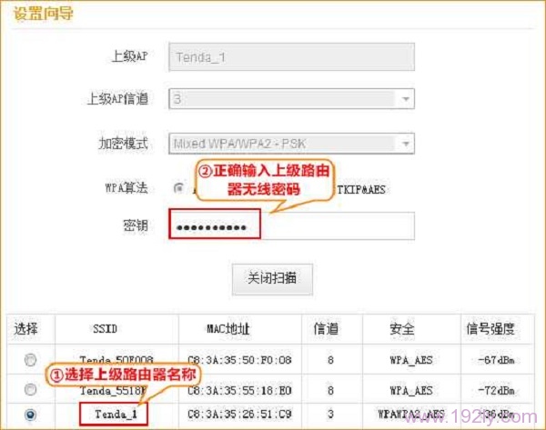 登录到腾达无线信号扩展器设置页面后,会自动扫描附近的WiFi信号,在扫描结果中,选择需要被扩展的WiFi信号即可。